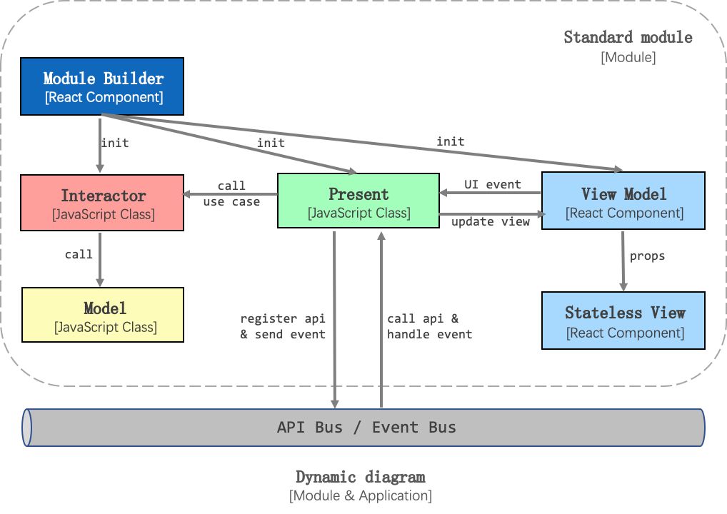 当模块需要对外暴露 api 和发送事件时,api bus和event bus被 presenter 方法调用;当外界需要调用 api 和广播事件时,presenter的方法被调用。