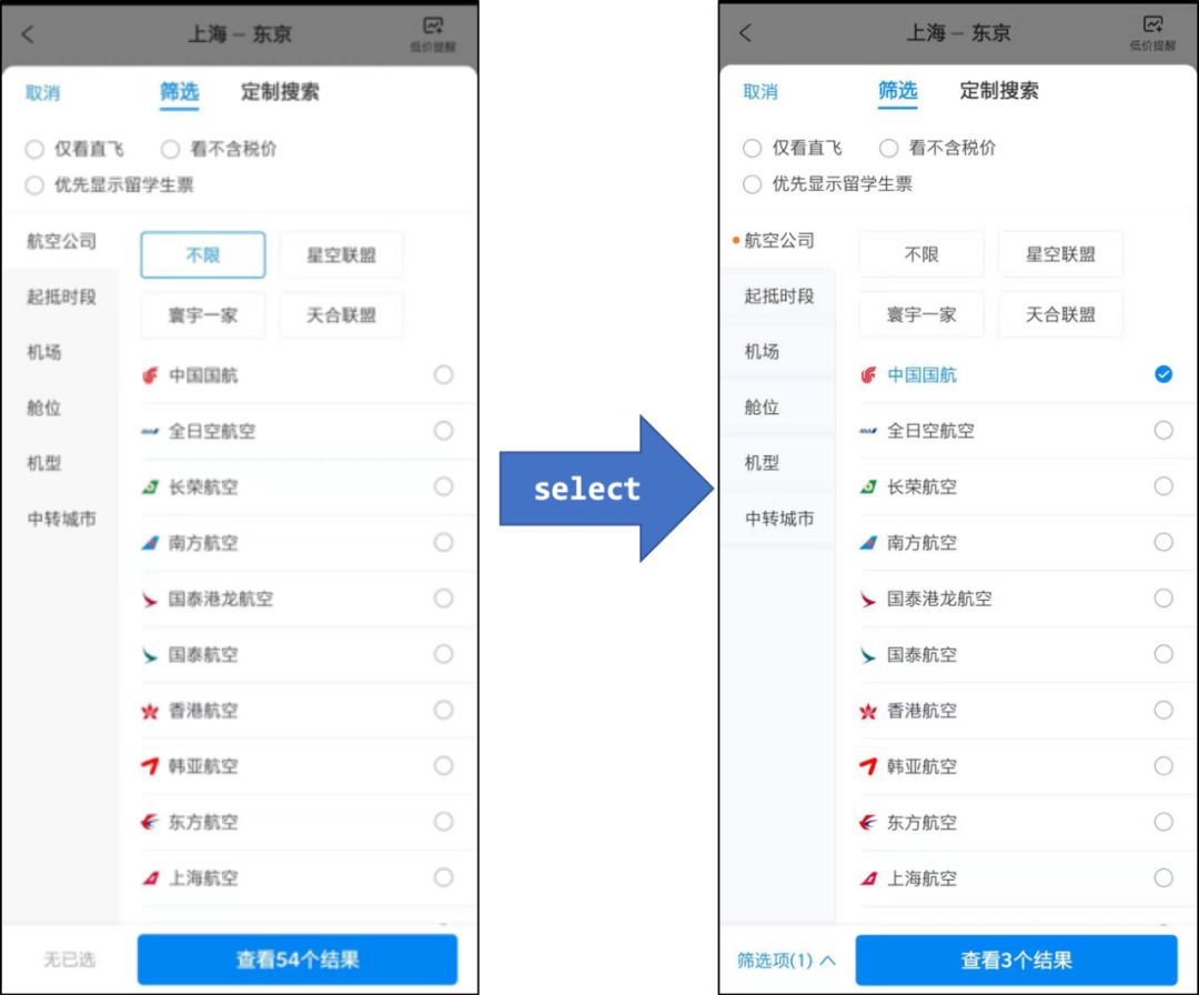 当用户选择中筛选项,如图中选中“中国国航”,会产生四处界面的改变: