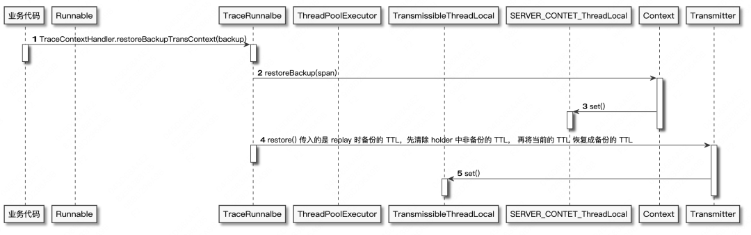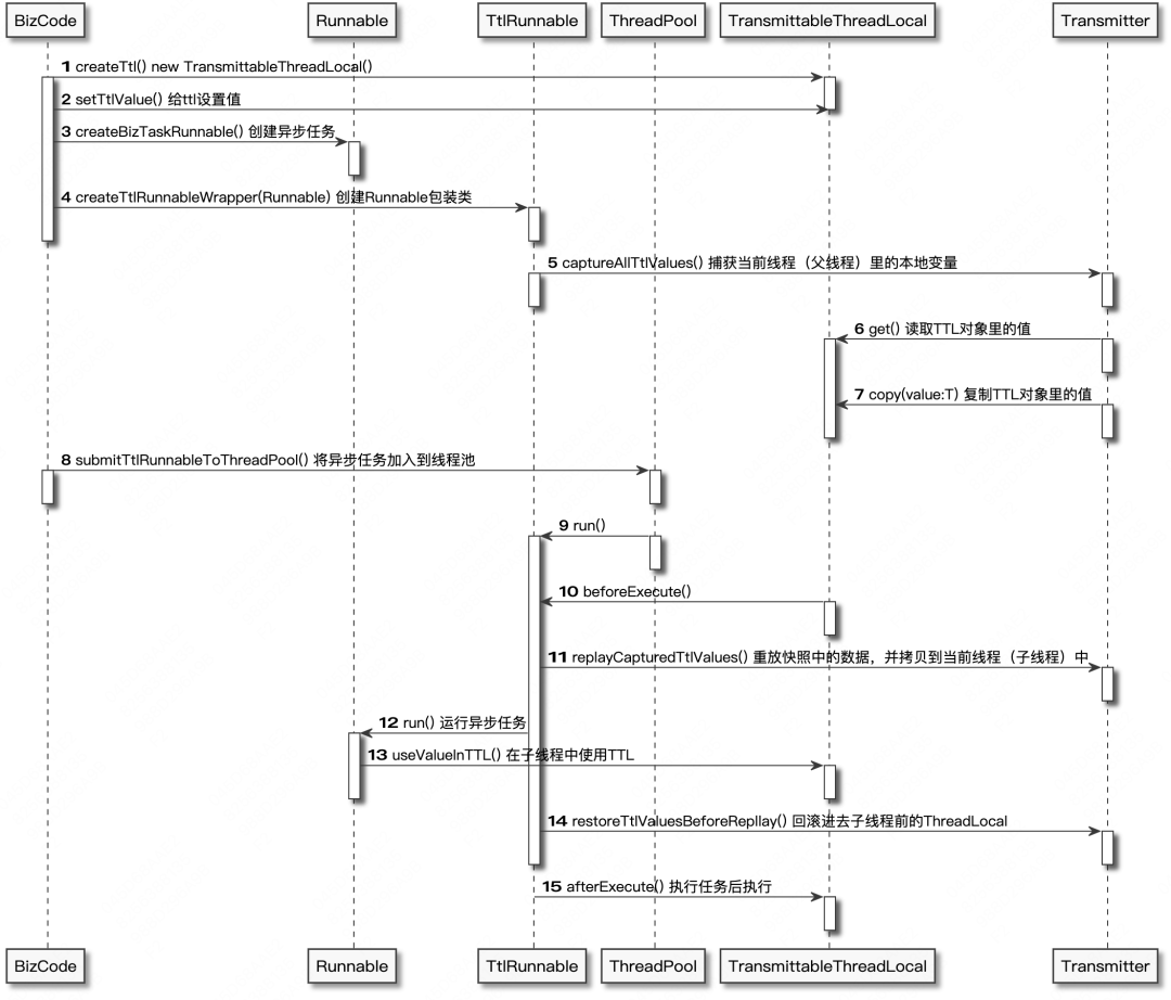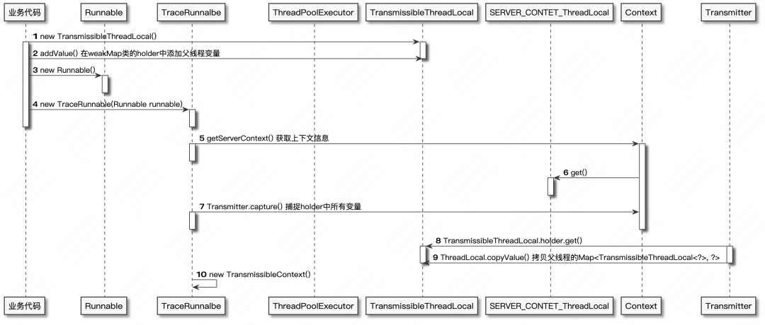 - TransmittableThreadLocal是阿里巴巴提供的解决跨线程传递上下文的InheritableThreadLocal子类,引入了holder来保存需要在线程间进行传递的变量,大致流程我们可以参考下面给出的时序图分析: