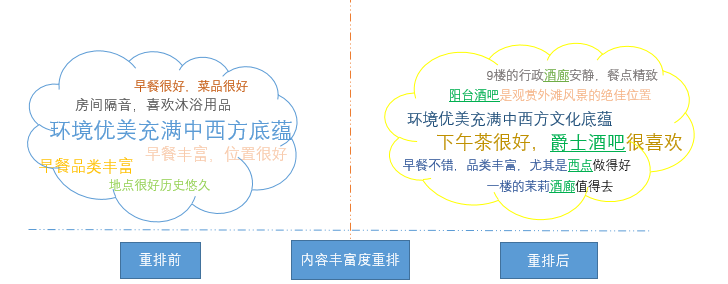 从图13结果看出,加入该逻辑后,能够避免抽取单一的例如早餐丰富的语句,更能够抽取出产品自身的特点的语句,如阳台酒吧、爵士酒吧、酒廊等等实体词汇。