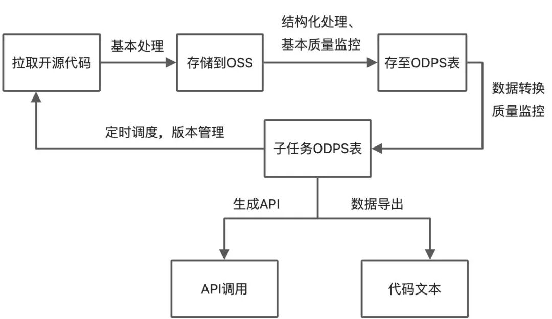 - 使用脚本获取OSS代码文件,进行结构化处理之后导入到ODPS表,同时会为ODPS表设置基本的DQC质量监控来保证数据的可用性。