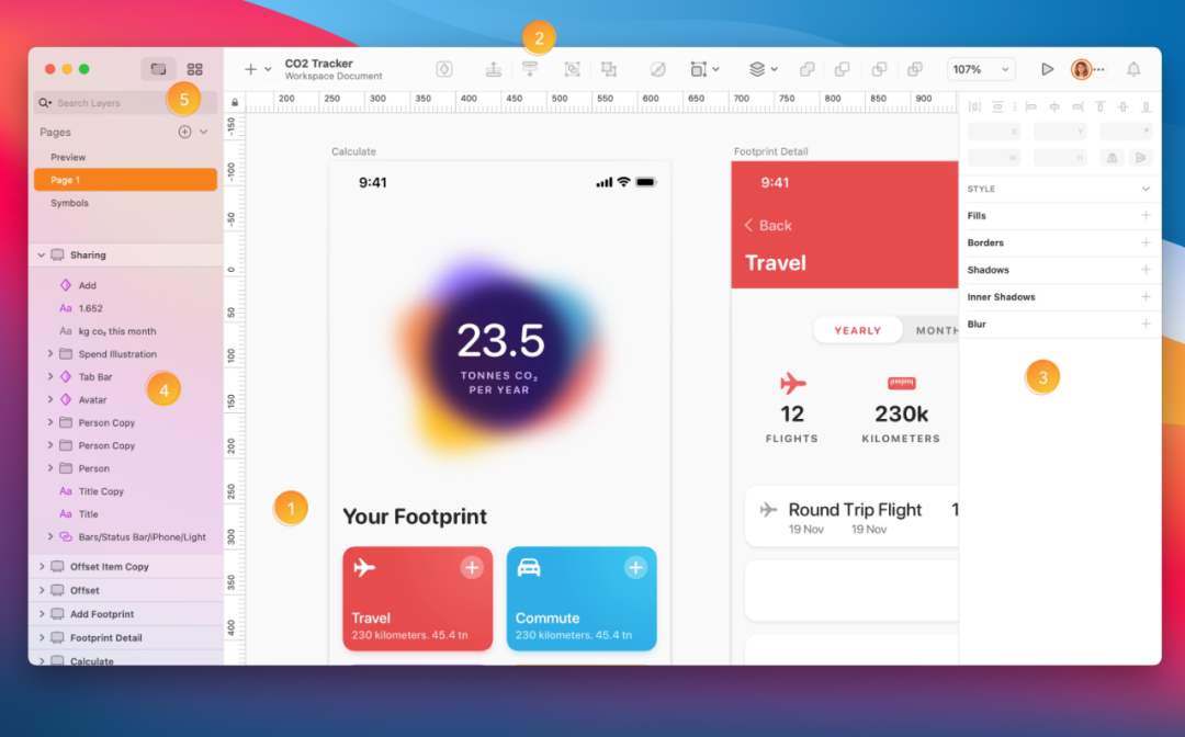例如设计师用Sketch来设计高保真的UI页面,需要使用Sketch中的一系列工具来完成,例如在工具栏( 图示区域2 )中添加 形状、图像、文本等不同类型的图层,在 Inspector 面板( 图示区域3 )中为图层添加样式。