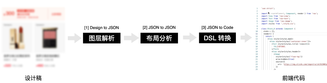 DSL转换(JSON to Code)的工作是将具有符合代码结构和语义的JSON描述转换成前端代码,主要包括: