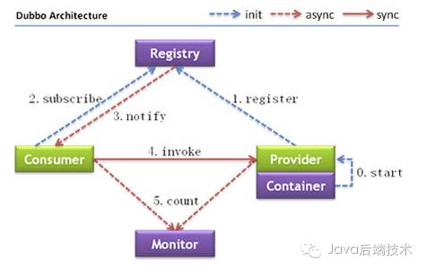 1、Provider:暴露服务的服务提供方。 Consumer: 调用远程服务的服务消费方。2、Registry:服务注册与发现的注册中心。Monitor: 统计服务的调用次调和调用时间的监控中心。3、Container: 服务运行容器。