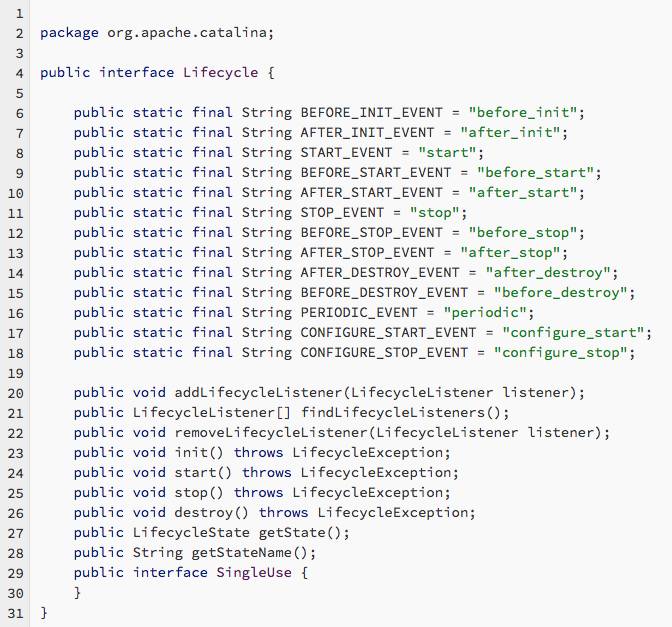 (1)定义了13个String类型常量:这些常量信息用于LifecycleEvent事件的type属性中,作用是区分组件发出的LifecycleEvent事件是的状态(如初始化前、启动前、启动中等)。这种设计方法可以让多种状态都发送同一种类型的时间,然后用其中的一个属性类区分状态而不用定义多种事件。