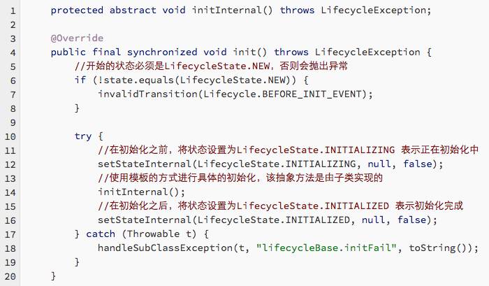 在init方法中调用了所对应的模板方法initInternal() 该方法并没有具体的实现,而是让子类去具体的实现,因此对于子类来说,执行生命周期的方法就是:initInternal、startInternal、stopInternal、destroyInternal;