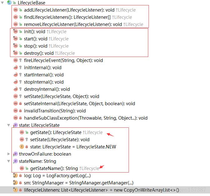 可以看出LifecycleBase定义了一个lifecycleListeners 集合用于保存所有的监听器,然后并定义了添加、删除、查找和执行监听器的方法;