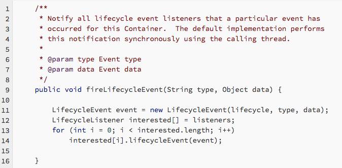 2、当container(主题)做某些动作的时候,会生成一个LifecycleEvent对象,这个对象标明当前这个动作是一个什么事件,然后LifecycleSupport会通知listener数组中的每一个观察者该事件的发生。