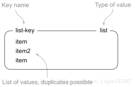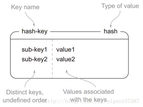 一个List散列类型的实例,是一个包含两个键值对的散列键: