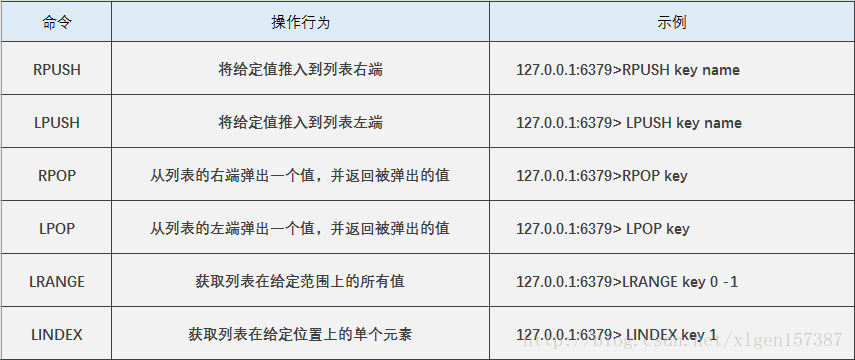 LPUSH和RPUSH命令分别用于将元素推入列表的左端和右端;LPOP和RPOP命令分别用于从列表的左端和右端弹出元素,也就是删除元素;