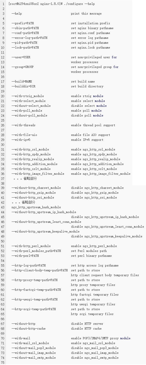 在Nginx(1.8.0)目录下适用./configure –help可以查看哪些模块已经被安装: