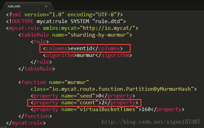 在schema.xml文件中的逻辑表event 使用的逻辑规则是sharding-by-murmur,因此就需要在rule.xml 中进行配置,这个路由规则是Hash一致性算法。