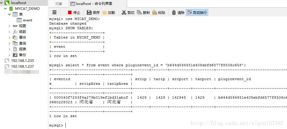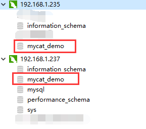 2、192.168.1.235、192.168.1.237的mycat_demo 表完全一样,这里可以任意建表,只要保持两个主机mysql的库、表一致: