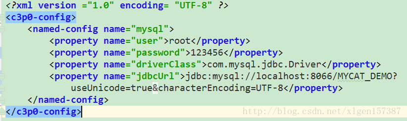 可以看出完全和使用普通的MySQL一样的,当然在代码中使用也是一样的,只需要把链接换成MyCat的即可。例如我配置的一个c3p0连接池如下: