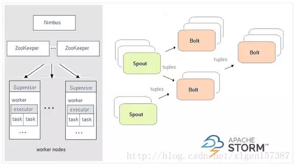 一个拓扑中包括<span style="font-size: 14px;">spout</span>和<span style="font-size: 14px;">bolt</span>两种角色,其中spout发送消息,负责将数据流以tuple元组的形式发送出去;而bolt则负责转换这些数据流,在bolt中可以完成计算、过滤等操作,bolt自身也可以随机将数据发送给其他bolt。由spout发射出的tuple是不可变数组,对应着固定的键值对。