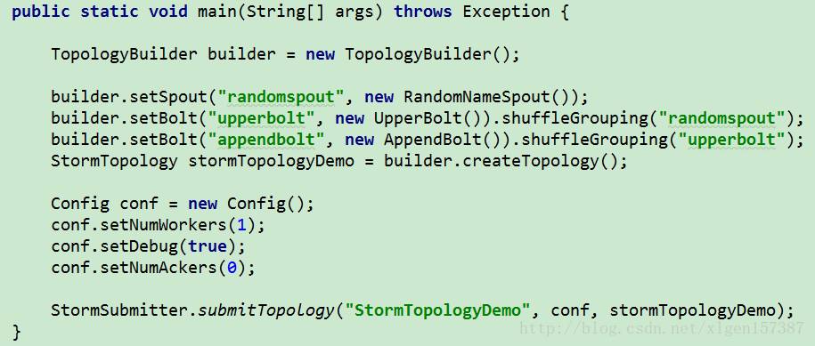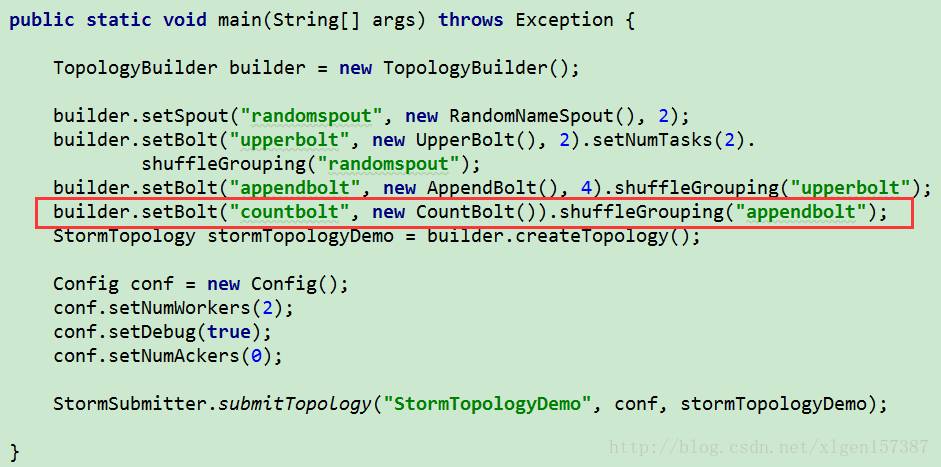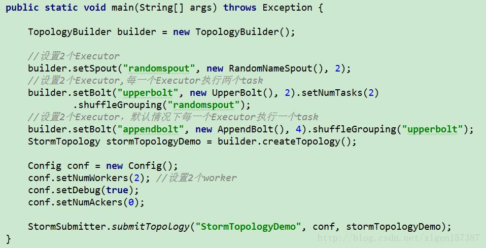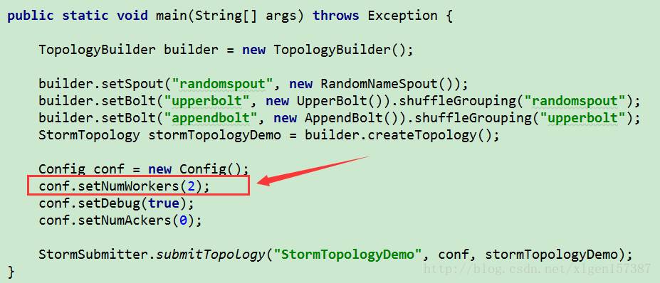 增加额外的worker是增加topology计算能力的简单方式,Storm提供了简单的配置使我们增加worker的方式变得很容易,只需修改如下代码即可,其它代码不变: