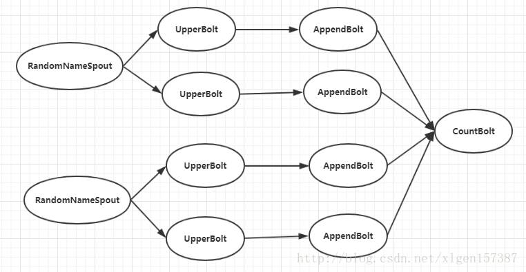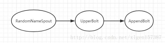 可以看到Topology中有<span style="font-size: 14px;">RandomNameSpout</span>和两个Bolt:<span style="font-size: 14px;">UpperBolt</span>、<span style="font-size: 14px;">AppendBolt</span>,执行流程如下: