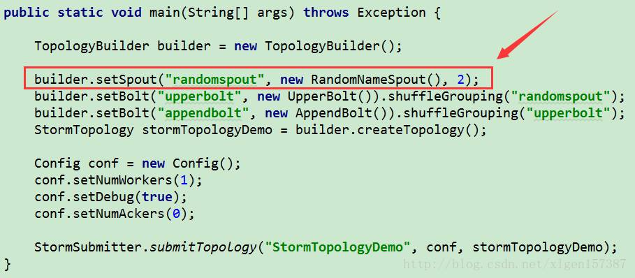 对于第三个参数,意思是:设置Spout的并发为两个task,每个task指派给各自的executor线程,由于默认情况下,每一个线程executor执行一个task,所以我们可以理解为,分配了两个线程executor,每一个executor线程执行一个任务task。
