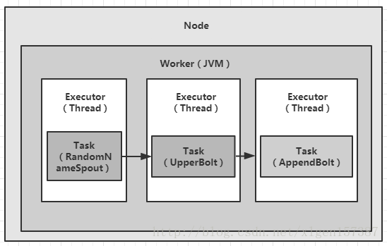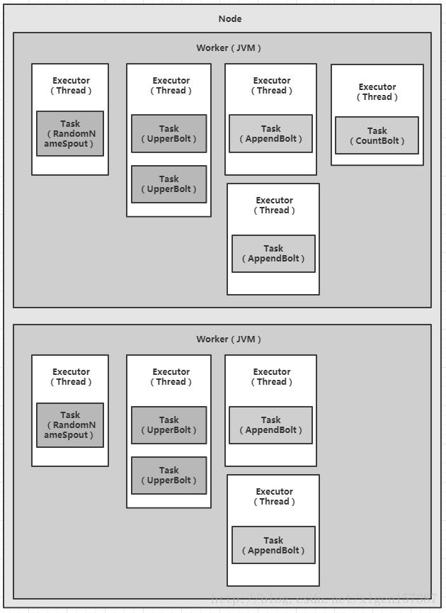 在Storm中,一个task可以简单的理解为在集群某节点上运行的一个spout或者bolt实例。在集群运行运行中,topology主要有四个组成部分:他们从低到高分别是:task(bolt/spout实例)、Executor(线程)、Workers(JVM虚拟机)、Nodes(服务器)