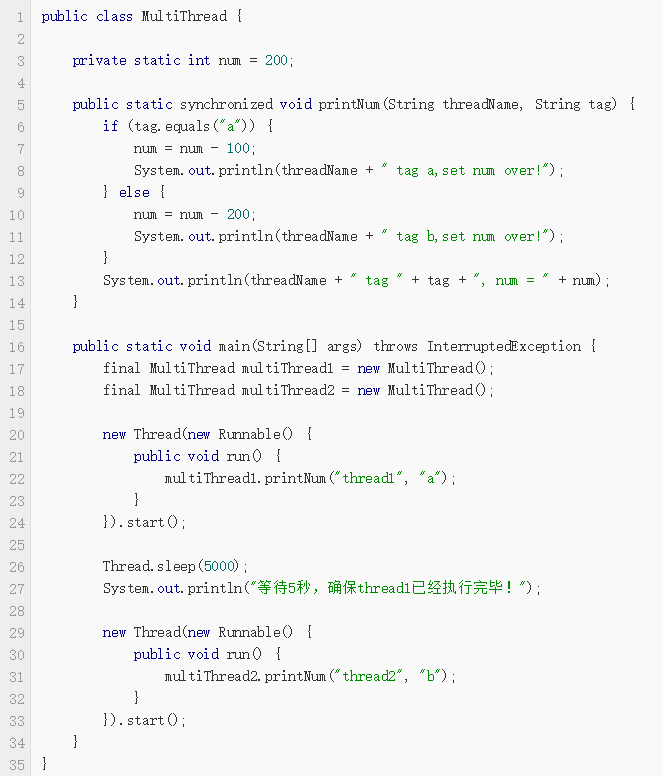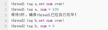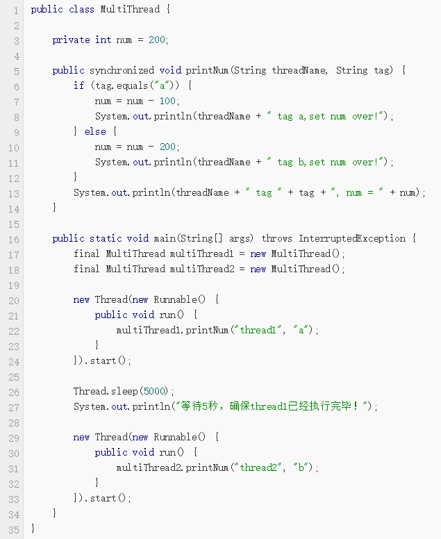 可以看出,有两个对象:multiThread1和multiThread2,如果多个对象使用同一把锁的话,那么上述执行的结果就应该是:<span style="font-size: 14px">thread2 tag b, num = -100</span>,因此,是每一个对象拥有该对象的锁的。