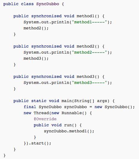 就如代码A体现的那样,线程T在执行到<span style="font-size: 14px">method1()</span>内部的时候,由于该线程已经获取了该对象<span style="font-size: 14px">syncDubbo</span> 的对象锁,当执行到调用<span style="font-size: 14px">method2()</span> 的时候,会再次请求该对象的对象锁,如果没有可重入锁机制的话,由于该线程T还未释放在刚进入<span style="font-size: 14px">method1()</span> 时获取的对象锁,当执行到调用<span style="font-size: 14px">method2()</span> 的时候,就会出现死锁。