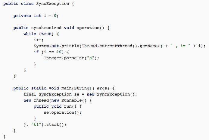就是说,当一个线程执行的代码出现异常的时候,其所持有的锁会自动释放,示例如下: