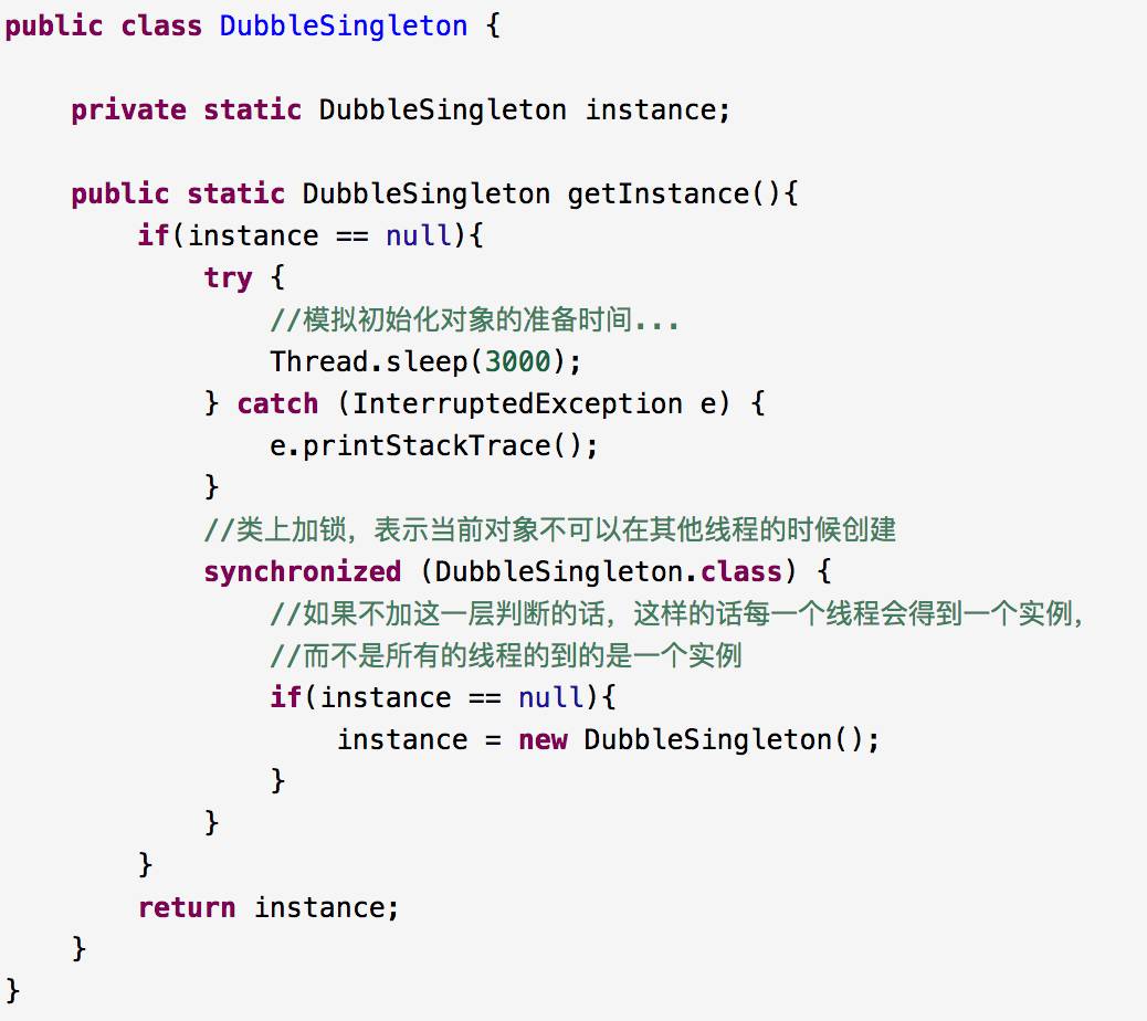 单例模式中有一个经典的实现就是:双重校验锁,其中就是用到了synchronized,实现代码如下: