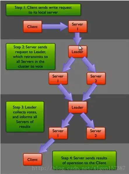 - a)、比如 Client 向 ZooKeeper 的 Server1 上写数据,发送一个写请求。
