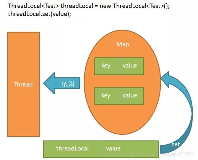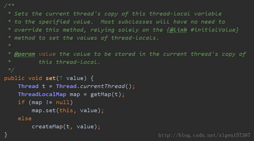 <span style="font-size: 14px">map.set(this, value);</span>方法,我们看到是以当前 thread 的引用为 key, 获得 <span style="font-size: 14px">ThreadLocalMap</span> ,然后调用 <span style="font-size: 14px">map.set(this, value);</span> 保存进 <span style="font-size: 14px">private Entry[] table</span> :