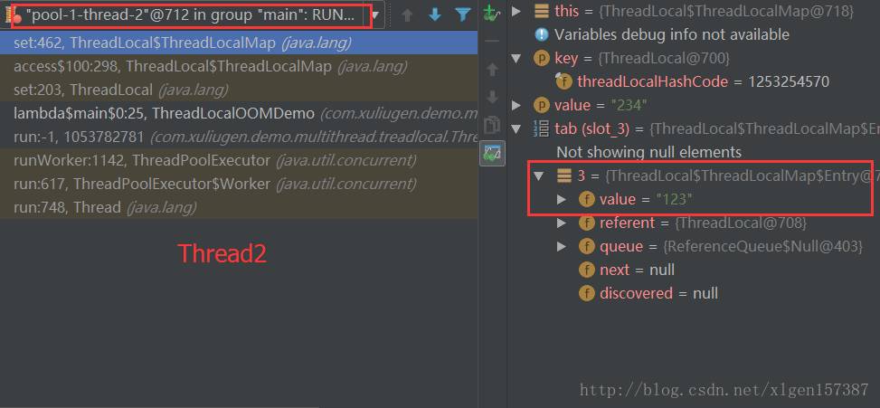 然后更改到Thread2,查看,由于多线程,线程1运行到上图情况,线程2运行到下图情况,也可以看出他们是不同的ThreadLocalMap: