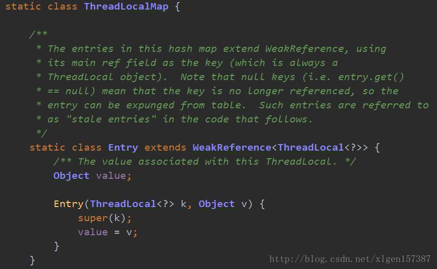 <span style="font-size: 14px">ThreadLocal</span>为key, 要保存的线程局部变量的值为<span style="font-size: 14px">value</span>。<span style="font-size: 14px">super(k)</span>调用的<span style="font-size: 14px">WeakReference</span>的构造函数,表示将<span style="font-size: 14px">ThreadLocal</span>对象转换成弱引用对象,用做key。