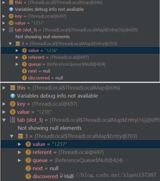 可以看到,在这个线程中的ThreadLocal变量的值始终是只有一个的,即以前的值被覆盖了的!这里是因为Entry对象是以该ThreadLocal变量的引用为key的,所以多次赋值以前的值会被覆盖,特此注意!