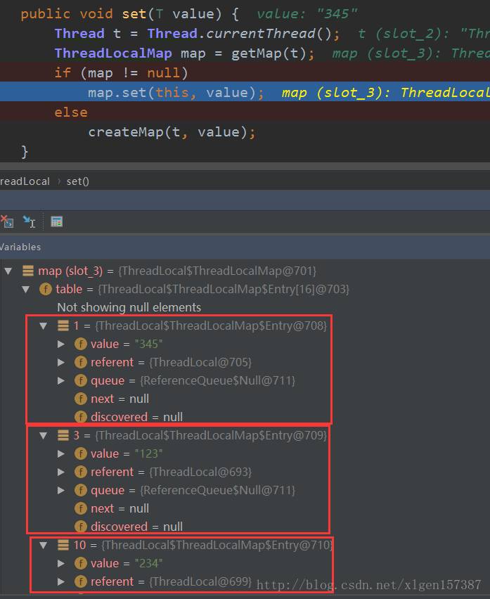 这样的话就相当于一个线程依附了三个ThreadLocal对象,执行完最后一个set方法之后,调试过程如下: