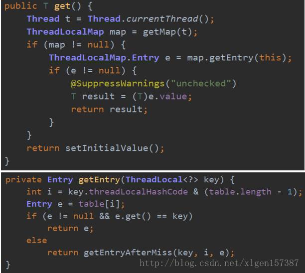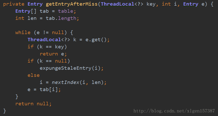 经过上述set方法的分析,对于get方法应该理解起来轻松了许多,首先获取ThreadLocalMap对象,由于ThreadLocalMap使用的当前的ThreadLocal作为key,所以传入的参数为this,然后调用<span style="font-size: 14px">getEntry()</span>方法,通过这个key构造索引,根据索引去table(Entry数组)中去查找线程本地变量,根据下边找到Entry对象,然后判断Entry对象e不为空并且e的引用与传入的key一样则直接返回,如果找不到则调用<span style="font-size: 14px">getEntryAfterMiss()</span>方法。调用<span style="font-size: 14px">getEntryAfterMiss</span>表示直接散列到的位置没找到,那么顺着hash表递增(循环)地往下找,从i开始,一直往下找,直到出现空的槽为止。