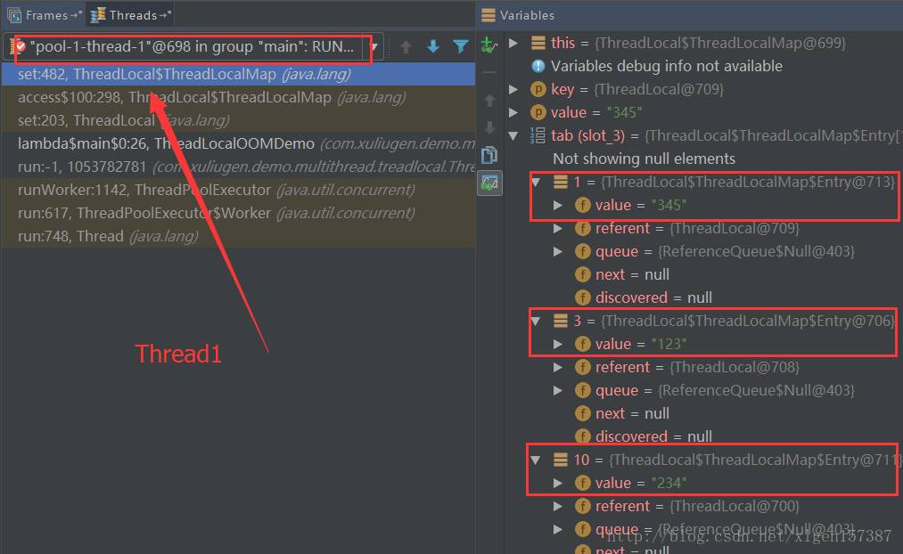 可以看到table(Entry集合)中有三个对象,对象的值就是我们设置的三个threadLocal的对象值;