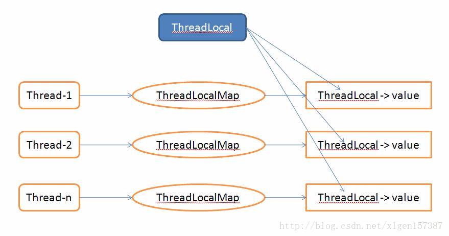 可以看到,<span style="font-size: 14px">set(T value)</span>方法为每个Thread对象都创建了一个ThreadLocalMap,并且将value放入ThreadLocalMap中,ThreadLocalMap作为Thread对象的成员变量保存。那么可以用下图来表示ThreadLocal在存储value时的关系。