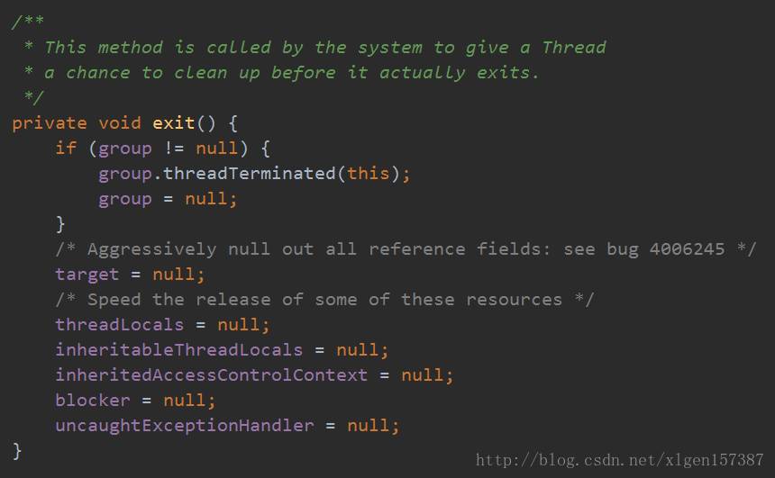 我们知道ThreadLocal变量是维护在Thread内部的,这样的话只要我们的线程不退出,对象的引用就会一直存在。当线程退出时,Thread类会进行一些清理工作,其中就包含ThreadLocalMap,Thread调用exit方法如下: