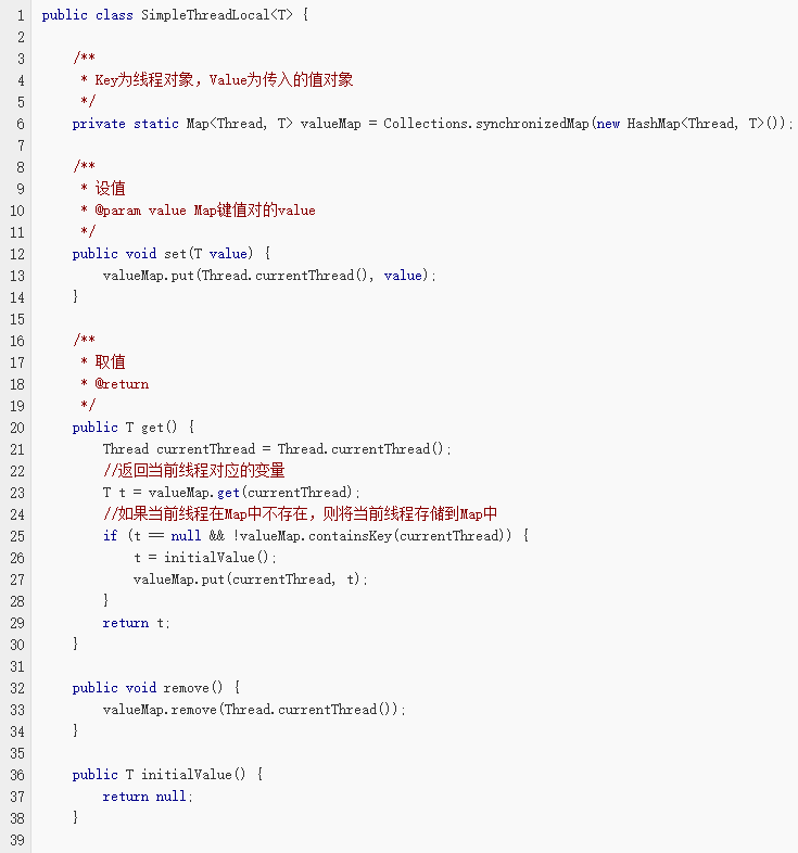 虽然上面的代码清单中的这个ThreadLocal实现版本显得比较简单粗,但其目的主要在与呈现JDK中所提供的ThreadLocal类在实现上的思路。