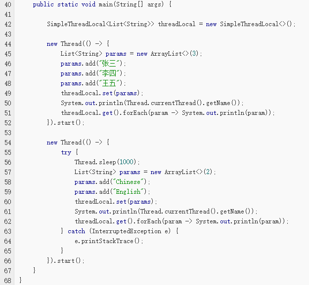 其实实现的思路很简单:在ThreadLocal类中有一个static声明的Map,用于存储每一个线程的变量副本,Map中元素的键为线程对象,而值对应线程的变量副本。我们自己就可以提供一个简单的实现版本: