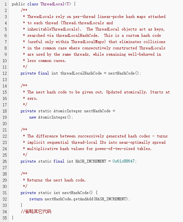 使用一个 <span style="font-size: 14px">static</span> 的原子属性 <span style="font-size: 14px">AtomicInteger nextHashCode</span>,通过每次增加 <span style="font-size: 14px">HASH_INCREMENT = 0x61c88647</span> ,然后 <span style="font-size: 14px">& (INITIAL_CAPACITY - 1)</span> 取得在数组 <span style="font-size: 14px">private Entry[] table</span> 中的索引。