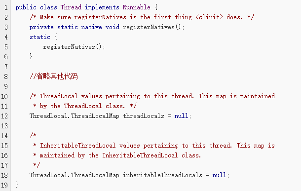 既然是线程局部变量,那么理所当然就应该存储在自己的线程对象中,我们可以从 Thread 的源码中找到线程局部变量存储的地方: