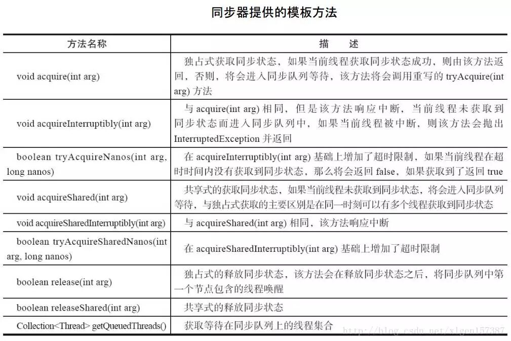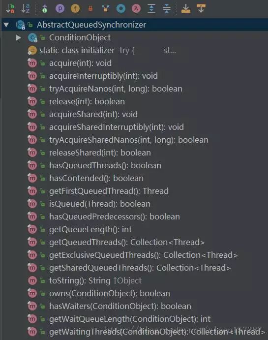 1、首先看一下AbstractQueuedSynchronizer的主要方法: