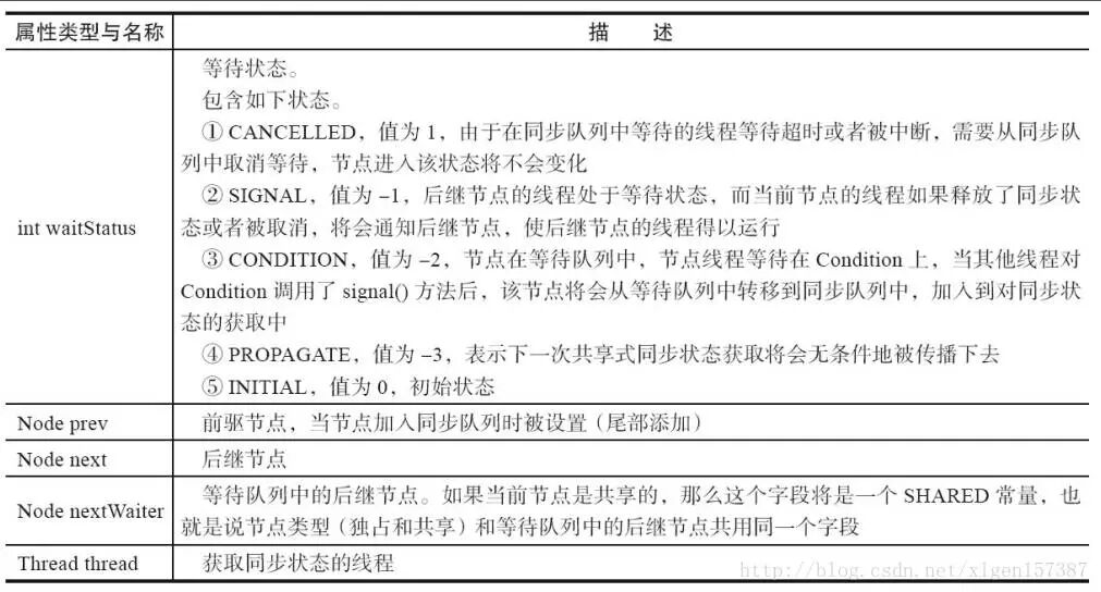 同步队列中的节点(Node)用来保存获取同步状态失败的线程引用、等待状态以及前驱和后继节点,节点的属性类型与名称以及描述如下: