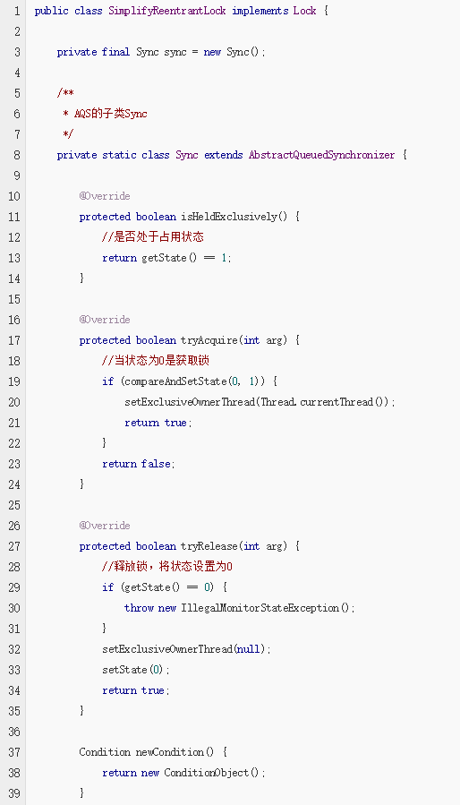 因为我们在上述的学习中已经知道了<span style="font-size: 14px">AbstractQueuedSynchronizer</span>同步器面向的是锁的实现者,即其内部已经封装了一些关于锁的操作。这也是上文中提到的两句话:(1)同步器的主要使用方式是继承,子类通过继承同步器并实现它的抽象方法来管理同步状态;(2)子类推荐被定义为自定义同步组件的静态内部类,同步器自身没有实现任何同步接口,它仅仅是定义了若干同步状态获取和释放的方法来供自定义同步组件使用。