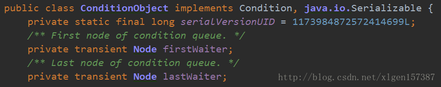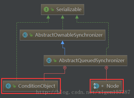 从上图中可以看到AbstractQueuedSynchronizer有两个内部类:一个是ConditionObject,另一个是Node。