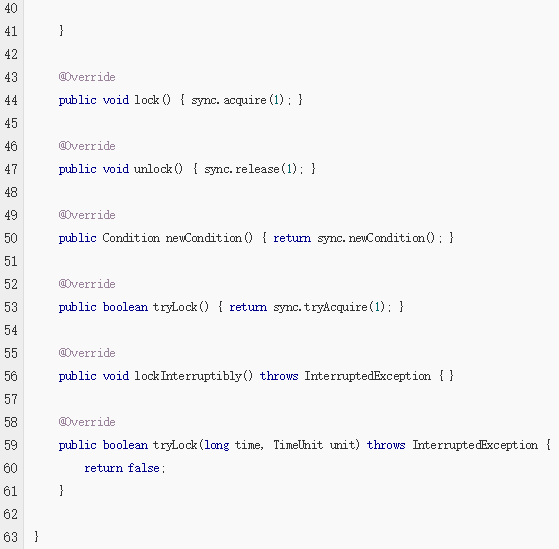 在上边的学习中,我们知道要是实现一个自定义的Lock实现类,首先要实现Lock接口,并且定义一个内部类继承AQS类,重写他的方法,示例如下: