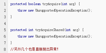 AbstractQueuedSynchronizer虽然没有抽象方法,但是提供了五个方法可以让我们在子类中重载,并且这五个方法都是空实现直接抛出异常,也就是说我们要使用这五个方法提供的功能,我们必须要自己在子类中进行实现,这也是“模板方法模式”的一种体现和使用。这五个方法的具体含义如下: