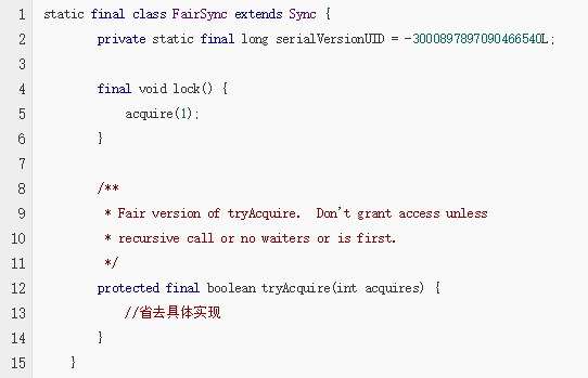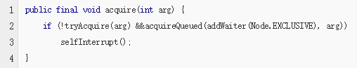 FairSync 实现了Sync的抽象方法<span style="font-size: 14px">lock()</span>,而具体的<span style="font-size: 14px">tryAcquire()</span>方法即是重写AQS中的<span style="font-size: 14px">tryAcquire()</span>方法,这里的<span style="font-size: 14px">lock()</span>方法调用了AQS提供的<span style="font-size: 14px">acquire()</span> 方法,AQS中acquire方法如下: