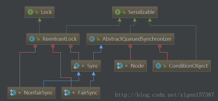 <span style="font-size: 14px">ReentrantLock</span>的内部类包含:<span style="font-size: 14px">Sync、NonfairSync(非公平锁)、FairSync(公平锁)</span>。而Sync正是继承了<span style="font-size: 14px">AbstractQueuedSynchronizer</span>这个抽象类,而<span style="font-size: 14px">NonfairSync</span>和<span style="font-size: 14px">FairSync</span>又是继承了<span style="font-size: 14px">Sync</span>的两个静态内部类。