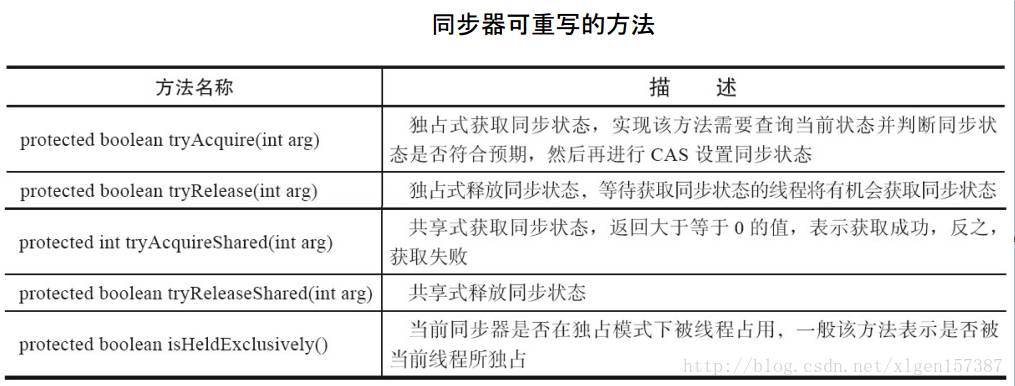 同步器的主要使用方式是继承,子类通过继承同步器并实现它的抽象方法(这里说抽象方法并不准确,因为他虽然是一个抽象类,但是并没有abstract修饰的抽象方法)来管理同步状态,在抽象方法的实现过程中免不了要对同步状态(上文中说的int成员变量)进行更改,这时就需要使用同步器提供的3个方法(<span style="font-size: 14px">getState()、setState()、compareAndSetState()</span>)来进行操作,因为它们能够保证状态的改变是安全的。